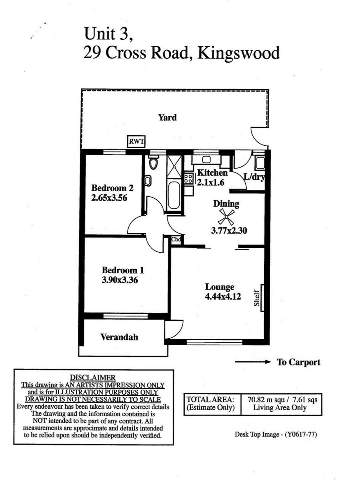 Two large bedroomsSpacious living room through double sliding doors to kitchen/dining areaTiled bathroom has bath, separate shower recess, basin & toilet.Separate laundry, private fenced rear yard.Carport at front of group.Suit retirees, country folk wanting a city base, single person, astute investor.
