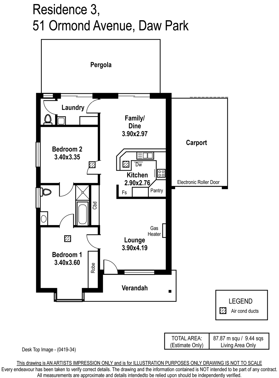 Features attractive living room with gas heater, two large bedrooms both having direct access to fully tiled bathroom incorporating bath, separate shower recess, built-in vanity unit, heat/fan, toilet.
